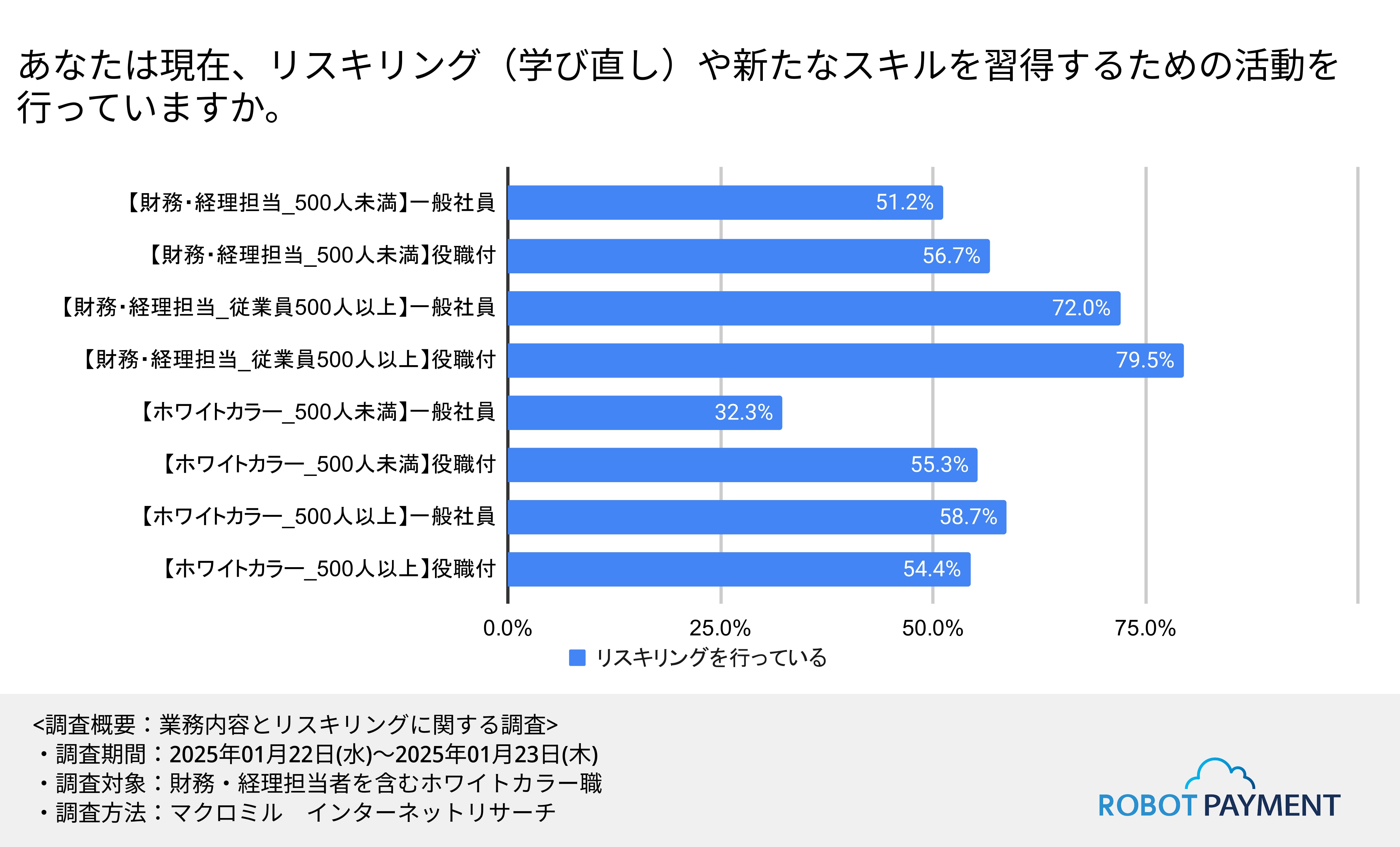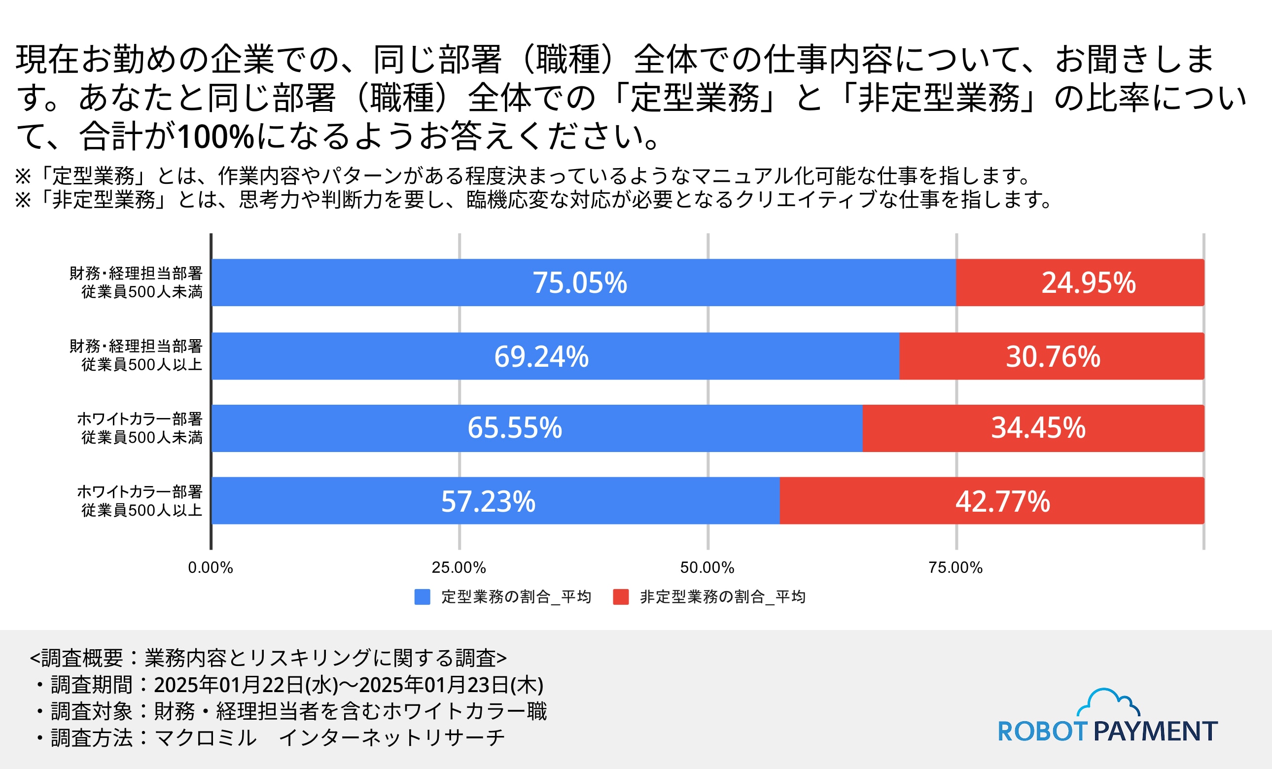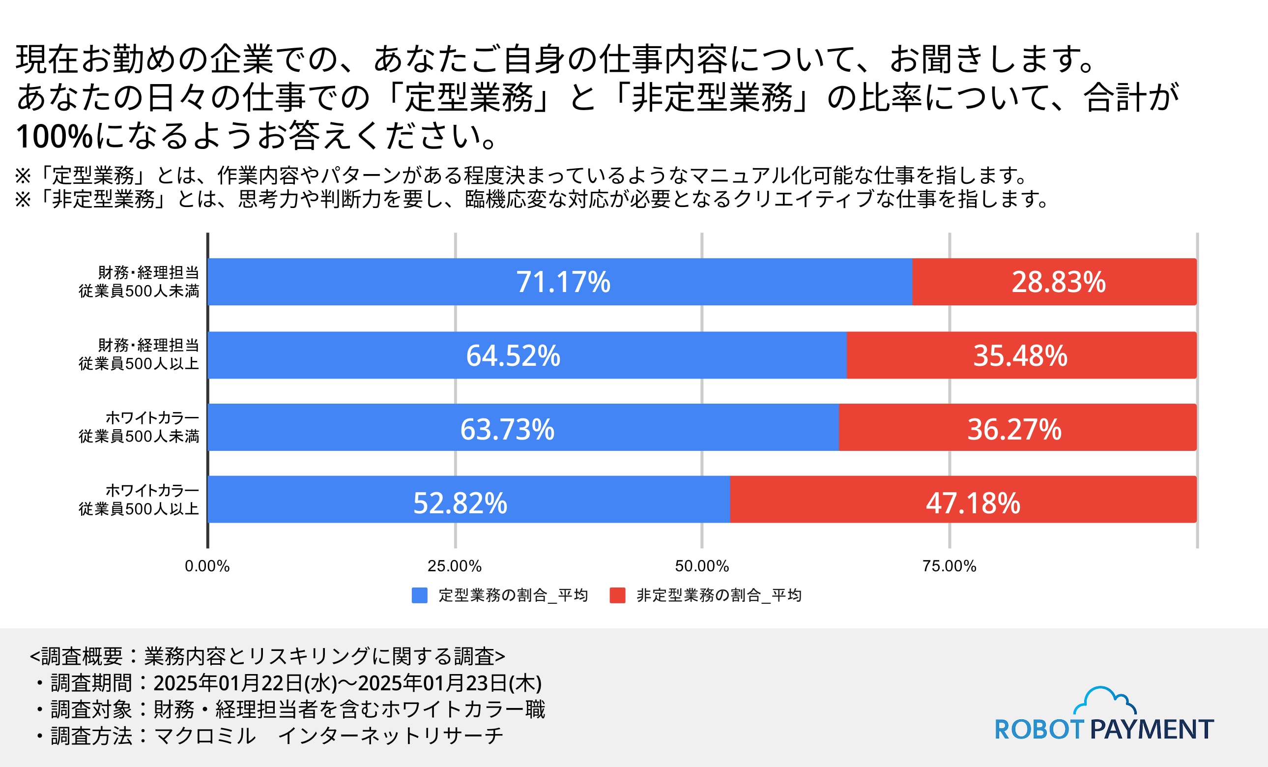 企業のお金の流れを円滑にし、新たな価値創造を促進する株式会社ROBOT PAYMENT(本社:東京都渋谷区、代表取締役執行役員CEO:清久 健也、証券コード:4374、以下 当社)は、経理財務職およびホワイトカラー職を対象に、定型業務と非定型業務の割合や、リスキリングの実施状況、キャリア志向に関する調査を実施し、その結果を発表しました。本調査は、変化の激しい現代社会において、従業員の能力開発とキャリアアップを支援するための基礎データとして活用されることを目的としています。