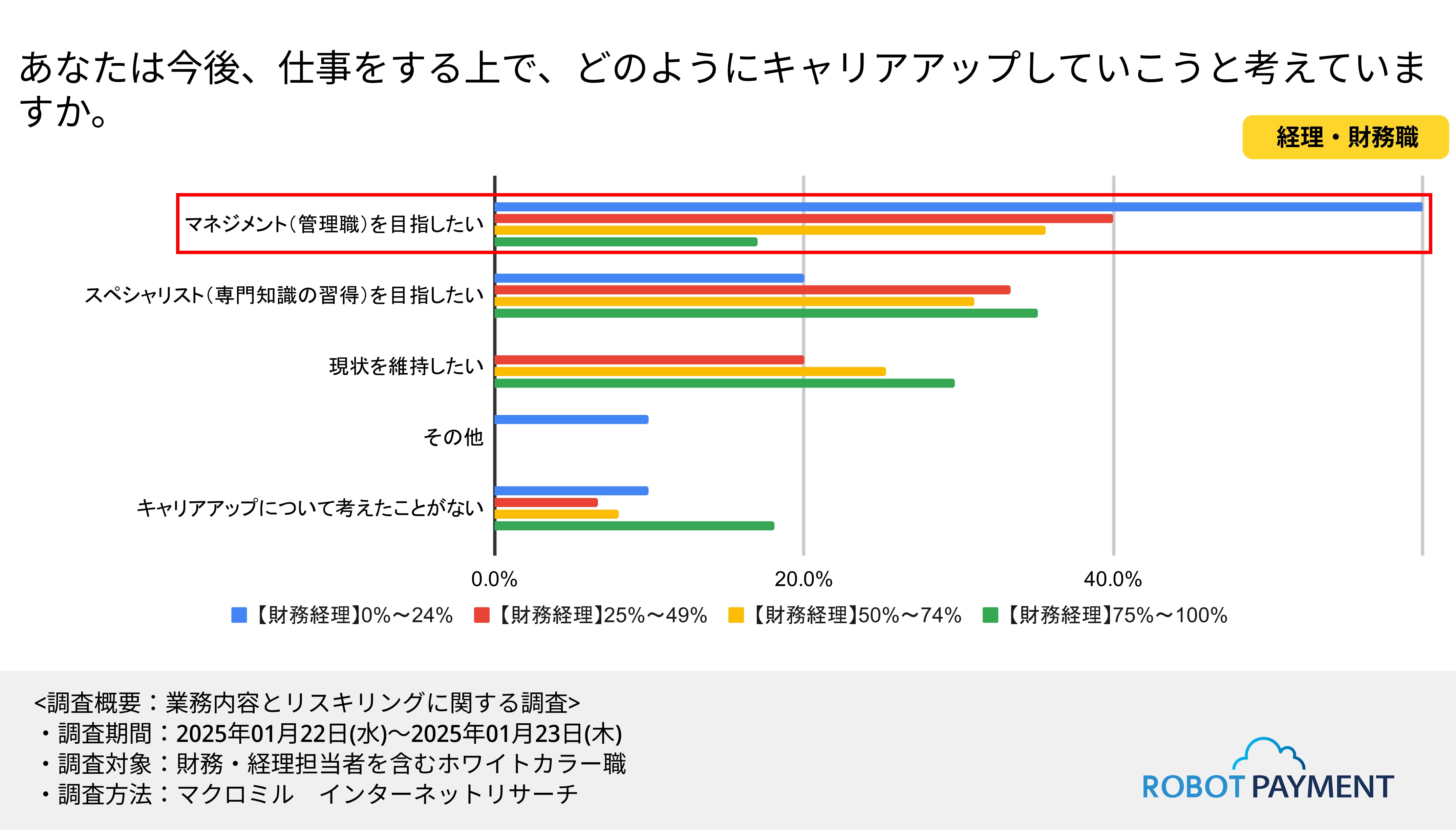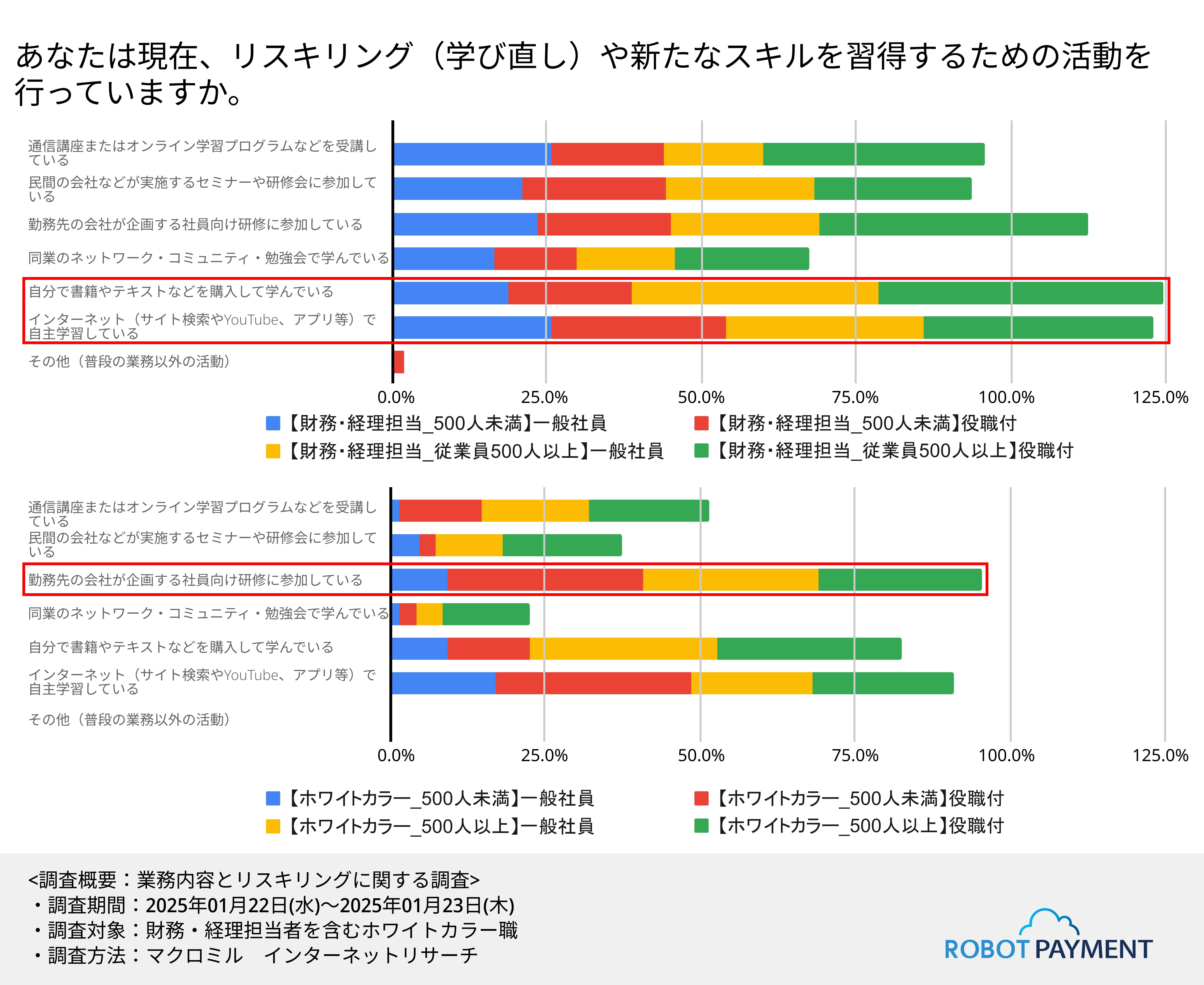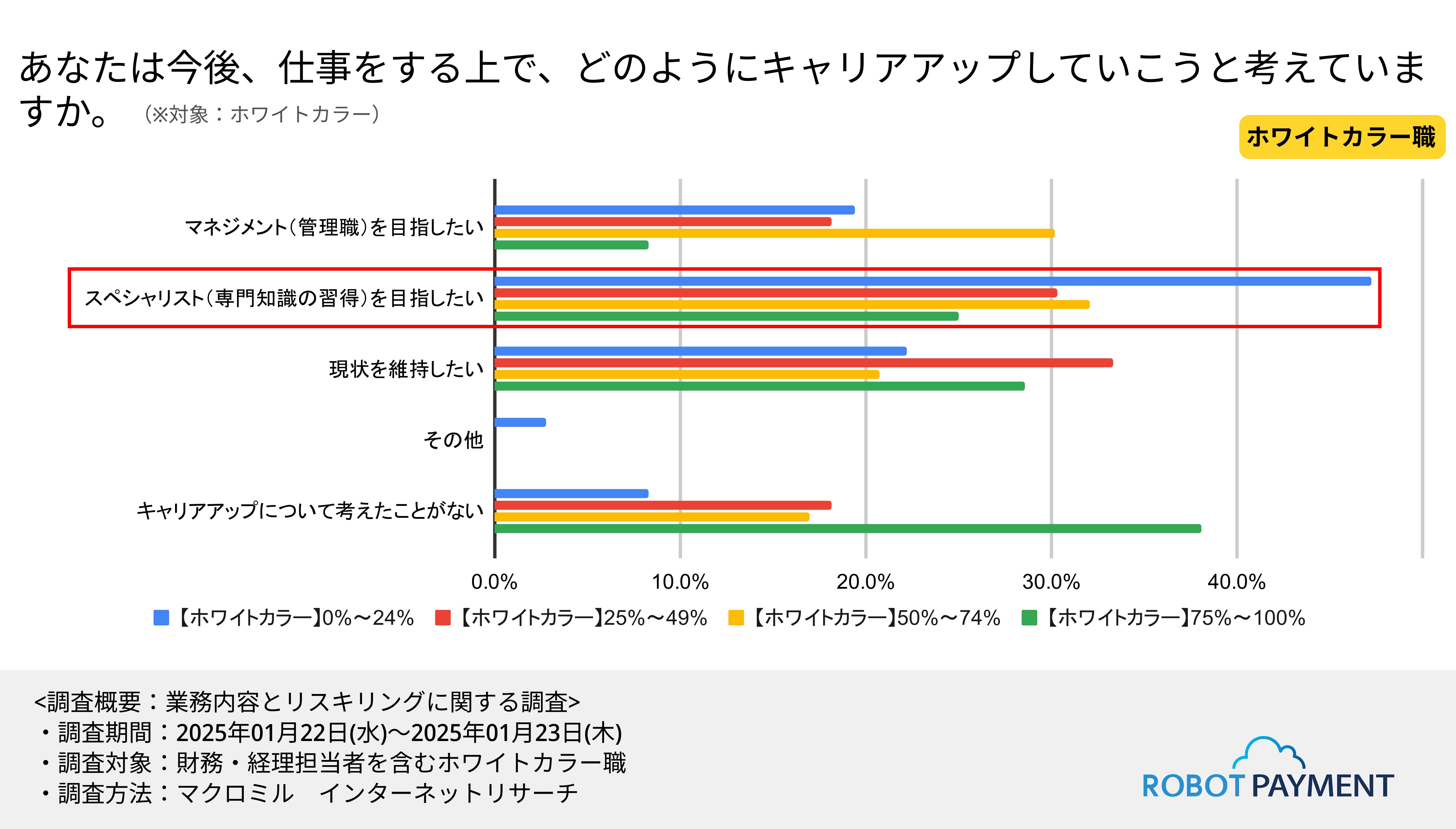 企業のお金の流れを円滑にし、新たな価値創造を促進する株式会社ROBOT PAYMENT(本社:東京都渋谷区、代表取締役執行役員CEO:清久 健也、証券コード:4374、以下 当社)は、経理財務職およびホワイトカラー職を対象に、定型業務と非定型業務の割合や、リスキリングの実施状況、キャリア志向に関する調査を実施し、その結果を発表しました。本調査は、変化の激しい現代社会において、従業員の能力開発とキャリアアップを支援するための基礎データとして活用されることを目的としています。