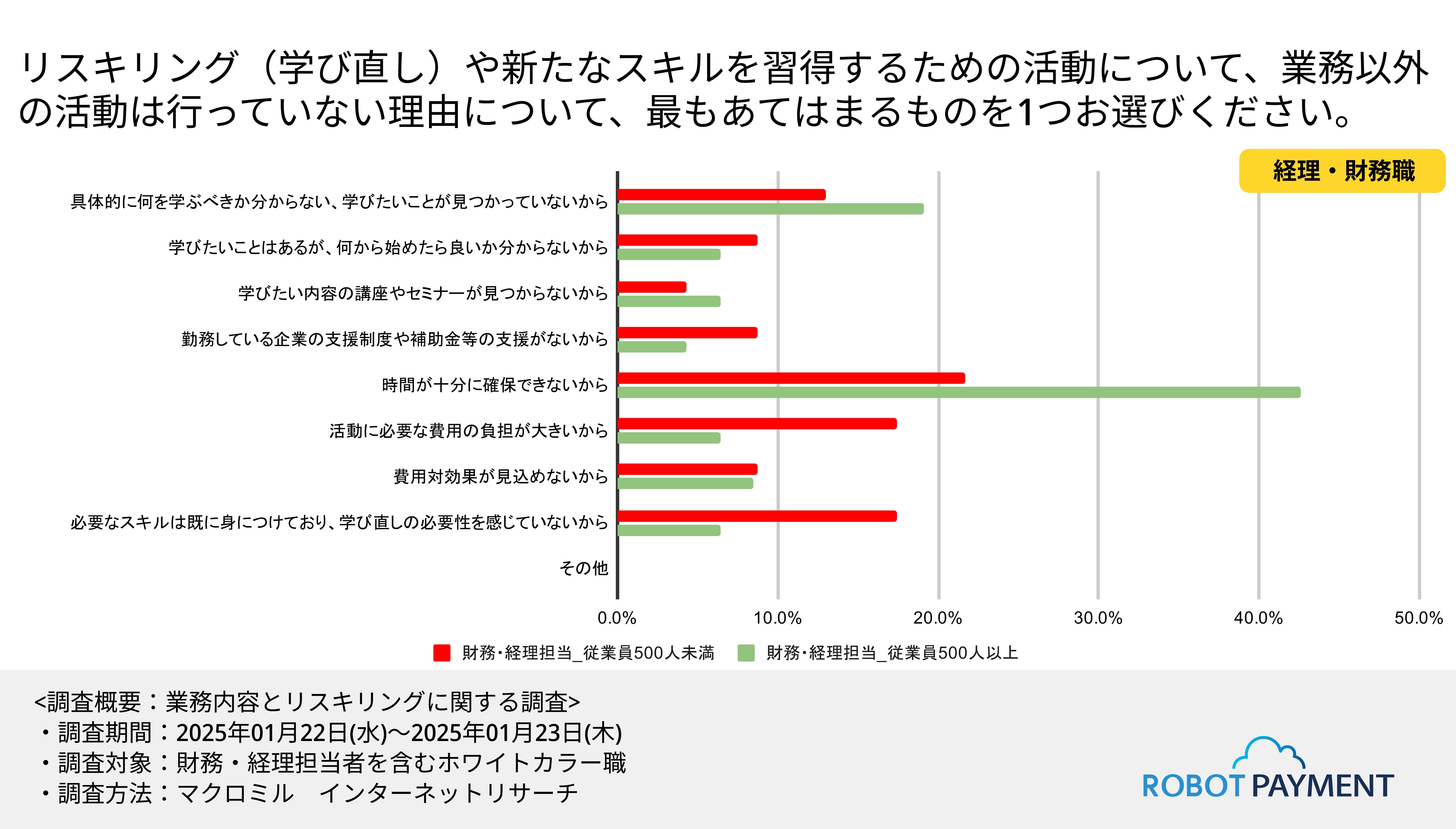 特に大企業の経理財務職は、リスキリングのモチベーションが高い一方、定型業務が多く、リスキリングの時間捻出ができない状況に