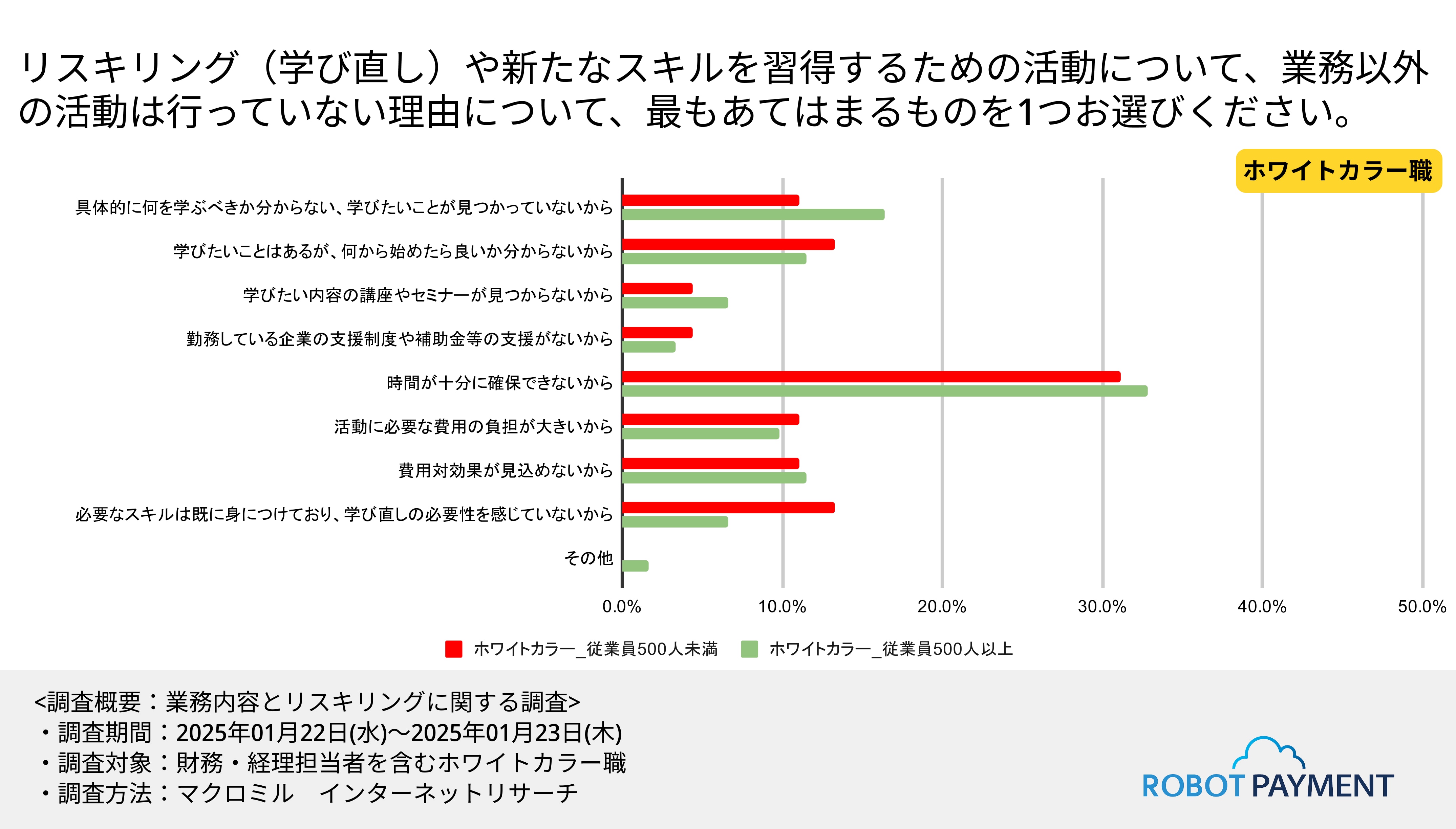 経理財務職、ホワイトカラー職ともに、最も多い理由は「時間が十分に確保できないから」でした。特に、この傾向は大企業で多く見られました。