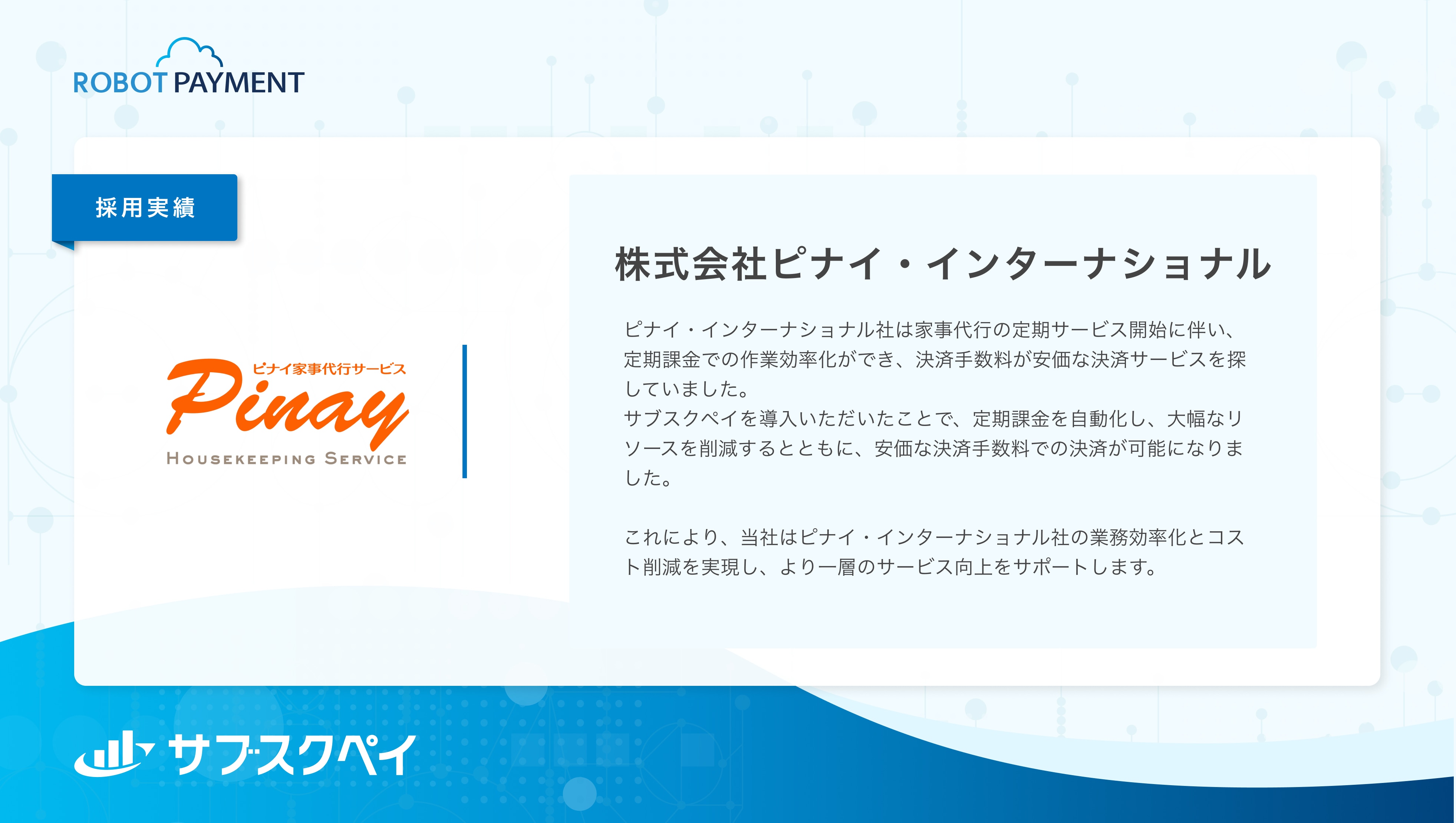 ピナイ・インターナショナル社は家事代行の定期サービスを提供しており、クレジットカード決済での定期課金を効率化でき、決済手数料が安価な決済サービスを探していました。サブスクペイを導入いただいたことで、APIを活用した定期課金管理の自動化を実現し、大幅なリソースを削減するとともに、安価な決済手数料での決済が可能になりました。