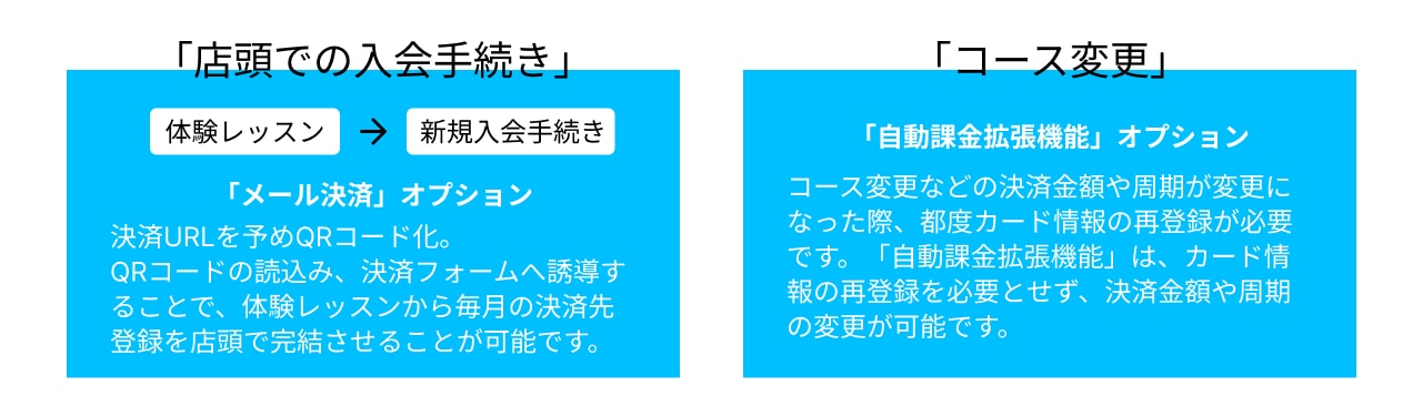 併せて、「自動課金拡張機能」や「メール決済」といったオプションを組み合わせることで、スクールに入会される生徒様へ柔軟かつスムーズに決済先のご登録をご案内できるほか、毎月の引き落とし業務にかかる作業が自動化され、経理担当者の業務工数や管理コストの大幅な削減が期待されています。