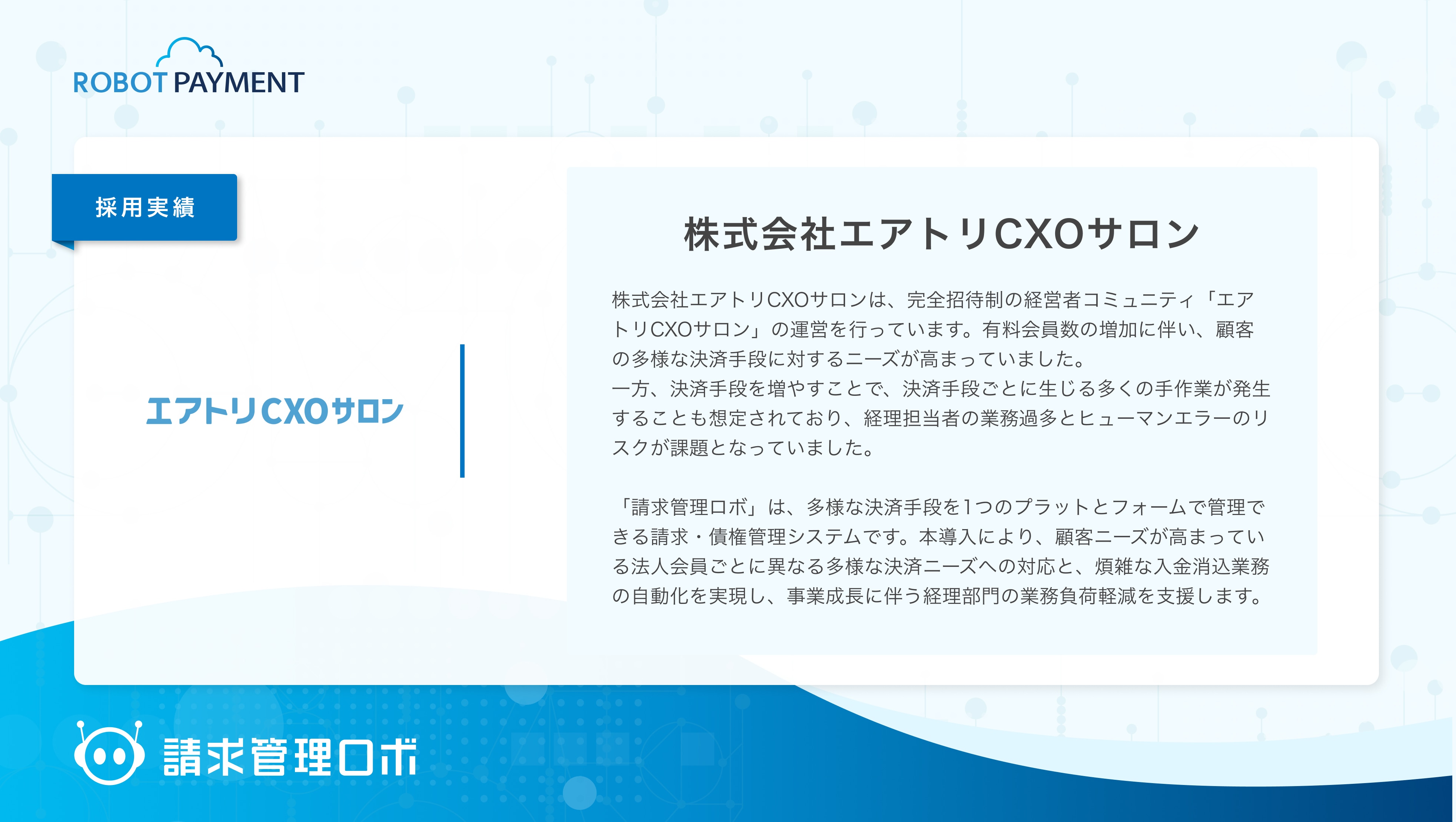 企業のお金の流れを円滑にし、新たな価値創造を促進する株式会社ROBOT PAYMENT(本社:東京都渋谷区、代表取締役執行役員CEO:清久 健也、証券コード:4374、以下 当社)が提供する請求・債権管理システム「請求管理ロボ」が、株式会社エアトリCXOサロンが運営するCXOコミュニティ事業において、請求・債権管理システム「請求管理ロボ」が採用されたことをお知らせいたします。