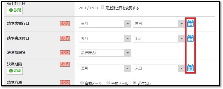 ▼支払期限(決済期限)を設定する請求管理ロボのカレンダー機能の画面例