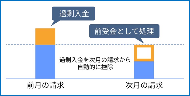 入金繰越機能は過剰入金を「繰越待ち」として登録することで、次回請求時に自動的に控除され、差引後の金額で請求書が発行されます。過剰分は前受金として処理され、仕訳データが自動生成されるため、経理処理の手間を軽減できます。