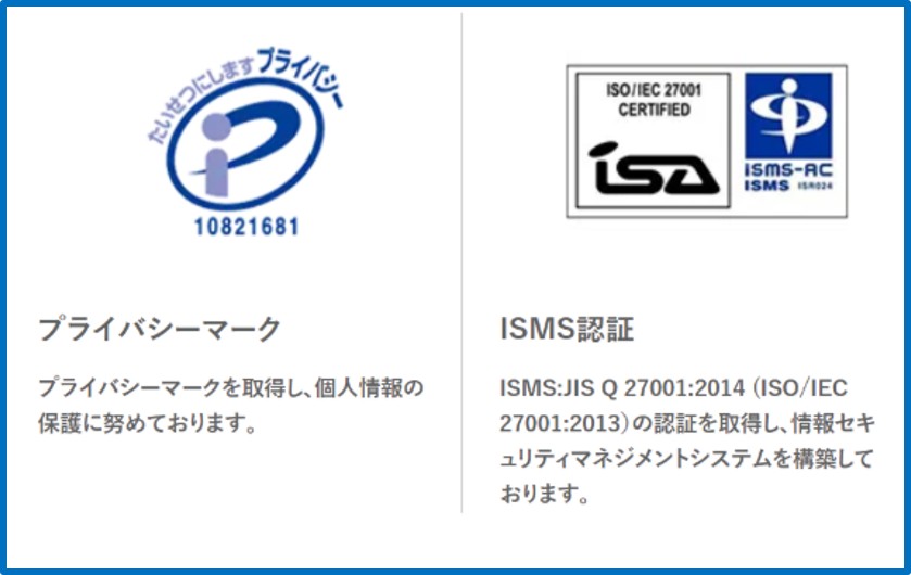 サブスクペイで口座振替を導入すると、プライバシーマークとISMS(JIS Q 27001:2014)認証の取得により、強固なセキュリティ対策がされたサービスをご利用いただけます。