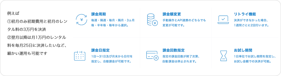 サブスクペイ for レンタルは業界最高品質の継続課金システムです。課金日・周期・回数・金額等を細かく設定でき、毎月の決済作業を完全自動で処理することで、担当者の負担を軽減します。