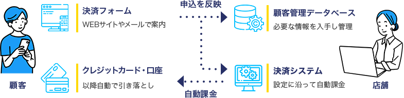 サブスクペイとは、店舗型の継続課金ビジネスに必要な機能を集約した決済代行サービスです。月額利用料の集金を毎月自動で対応し、また決済情報と紐づけて顧客情報の管理も行うことができます。