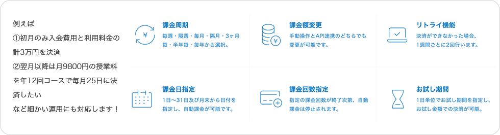 サブスクペイは業界最高品質の継続課金システムです。課金日・周期・回数・金額等を細かく設定でき、毎月の決済作業を完全自動で処理することで、担当者の負担を削減します。