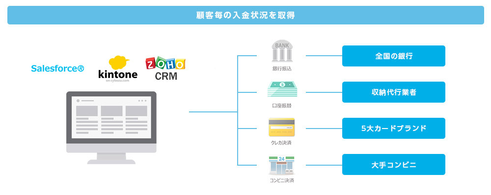SFA/CRMと決済情報がリンク。金融機関の入金データを取得し、取引先ごとや商談ごとに見える化します。 API等を活用し、決済システムがSalesforce®、kintoneと連携。 これまで複数の部署・部門に点在していた顧客情報を一つに集約。自社システムの開発やアナログな二重管理を無くし、業務の効率性と社内の連帯感を高めます。